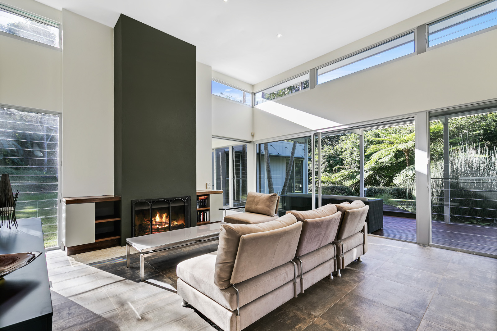 An open fireplace adds a touch of coziness in cooler months and large sliding glass doors give way to a spacious entertaining deck.